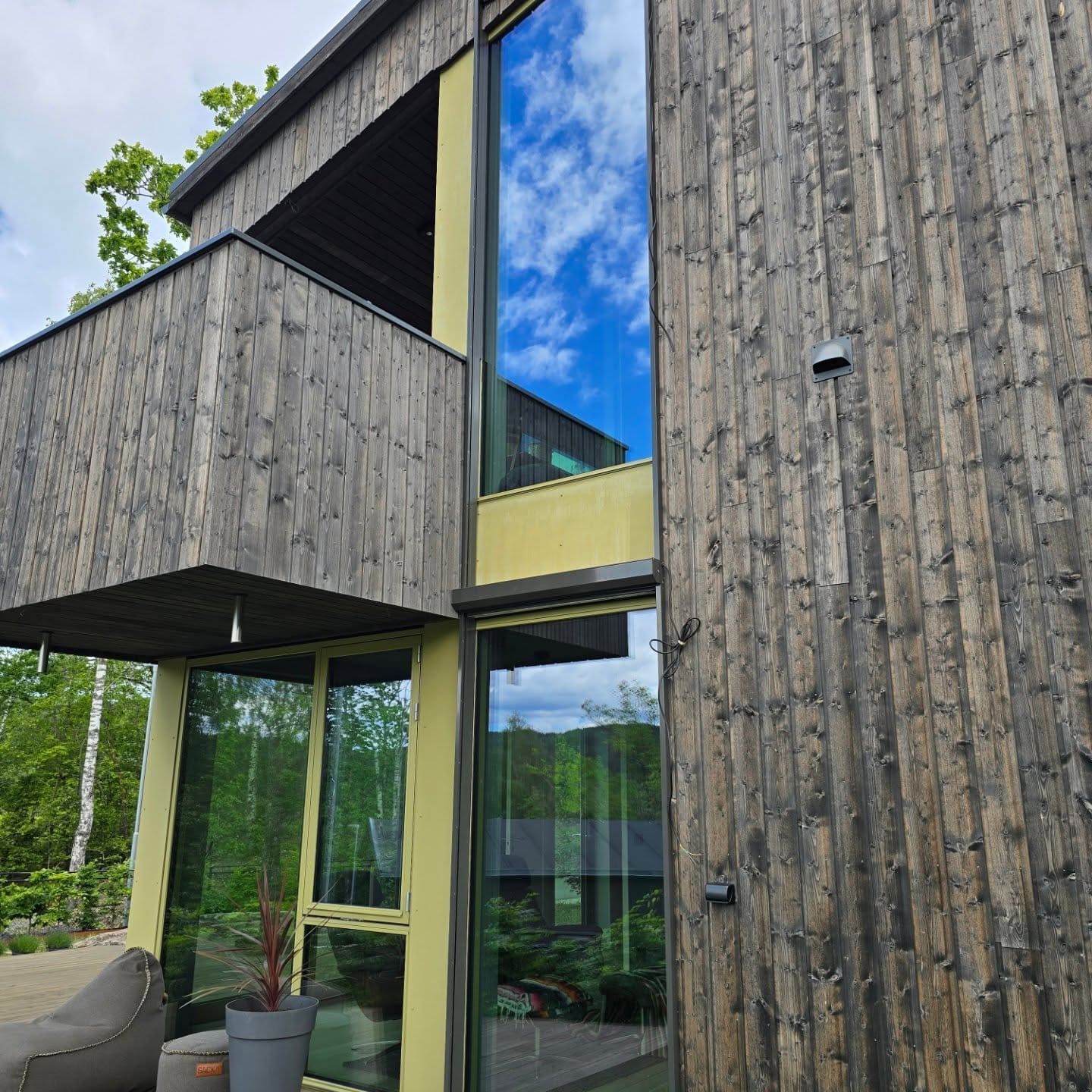 Løsningen ble spesialtilpassede hjørnescreens med wire – en diskret, men solid variant som bevarer husets stramme linjer og minimalistiske stil.